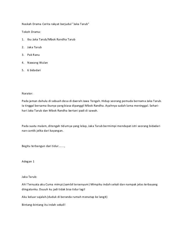 Bidadari yang bernama Nawangwulan itu bersedia ikut pulang ke rumah Jaka Tarub karena hari sudah senja. Naskah jaka tarub. Inilah pembahasan selengkapnya mengenai contoh naskah drama jaka tarub dan 7 bidadari. Jaka Tarub And 7 Bidadari Dalam Bahasa. Namun sebelum itu mari kita simak apa sih pengertian dari drama itu. Contoh Naskah Drama Jaka Tarub dan 7 Bidadari dalam Bahasa Inggris.